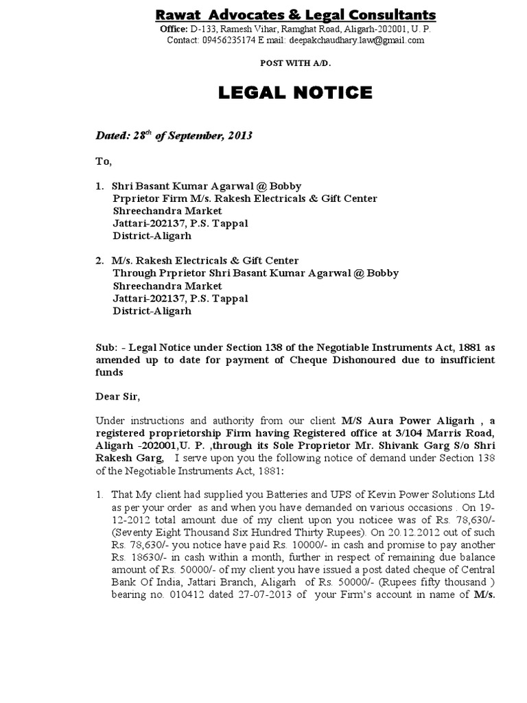 1024x576 - 15 days from the date of receipt of this notice, failing which my client has given me clear instructions to file civil, criminal., suit for recovery section 138 of negotiable instrument act and money suit under order 37 of the c.p.c.