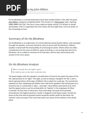 On His Blindness By John Milton Analysis : Milton's on his blindness discusses his feelings, fears and doubts regarding his failed sight, which was due to excessive writing and reading different languages.