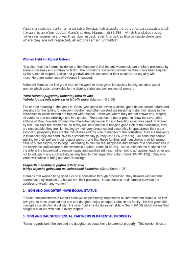 Yatra Naryastu Pujyante Ramante Tatra Devata In Telugu / Where women are worshipped there the angels tread.